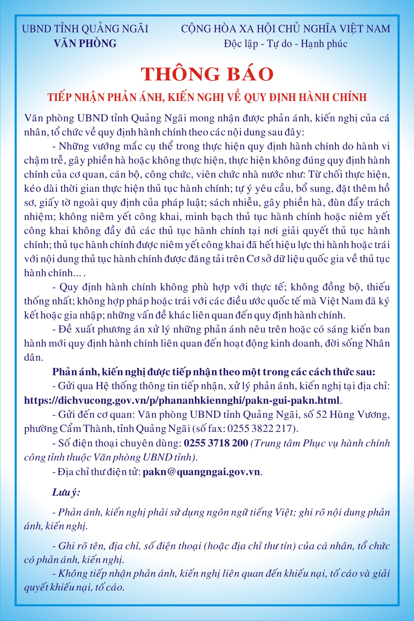 Thông báo của Văn phòng UBND tỉnh Quảng Ngãi về tiếp nhận phản ánh, kiến nghị về quy định hành chính
