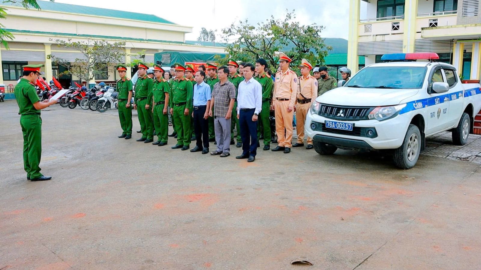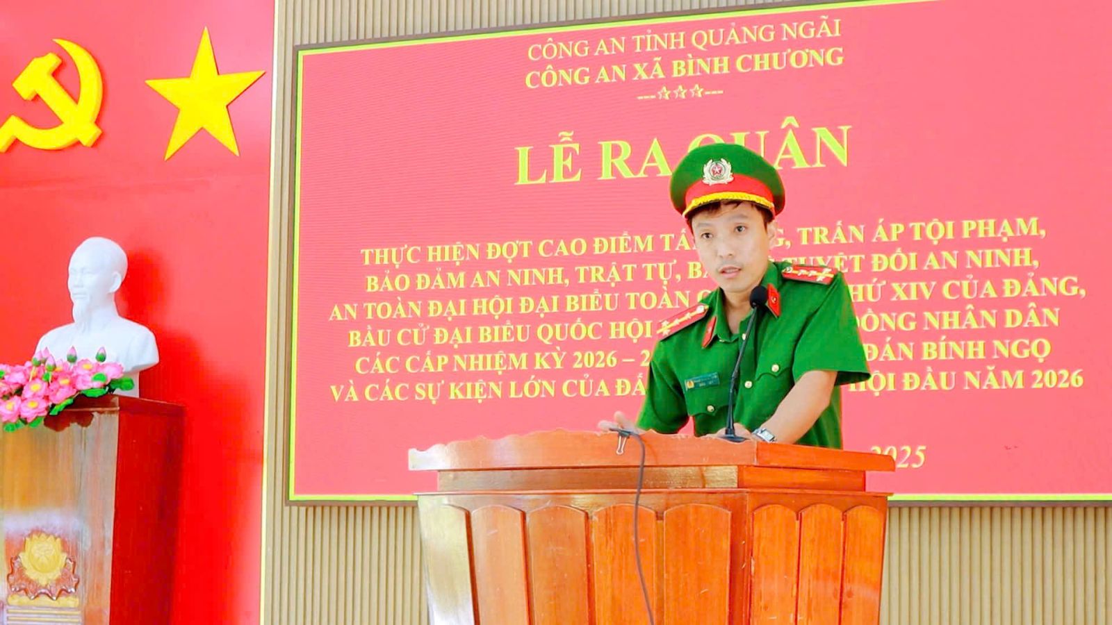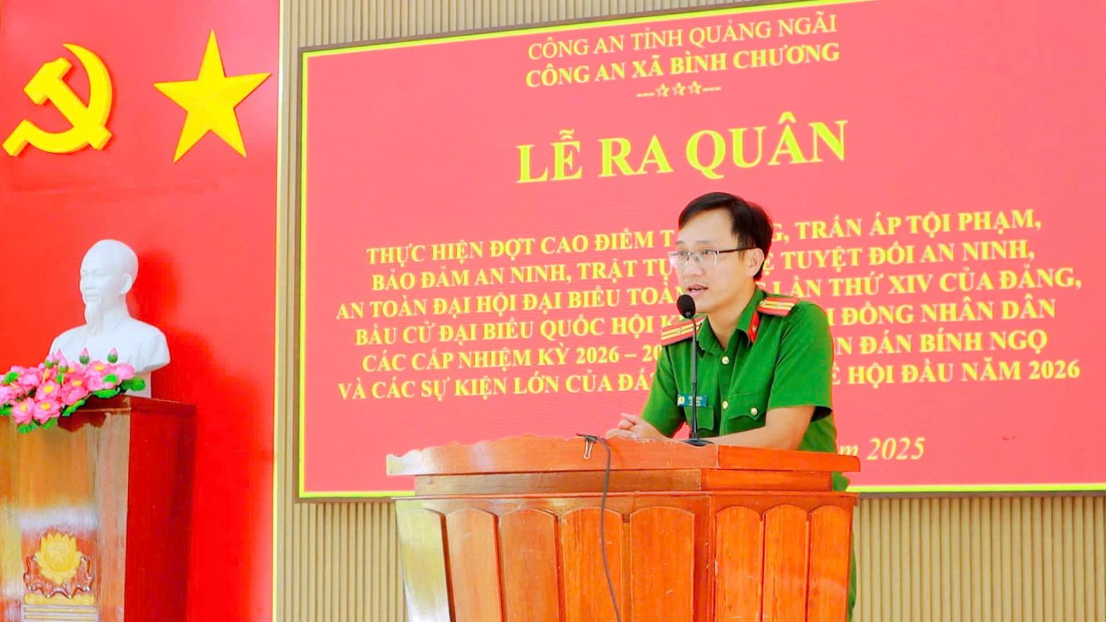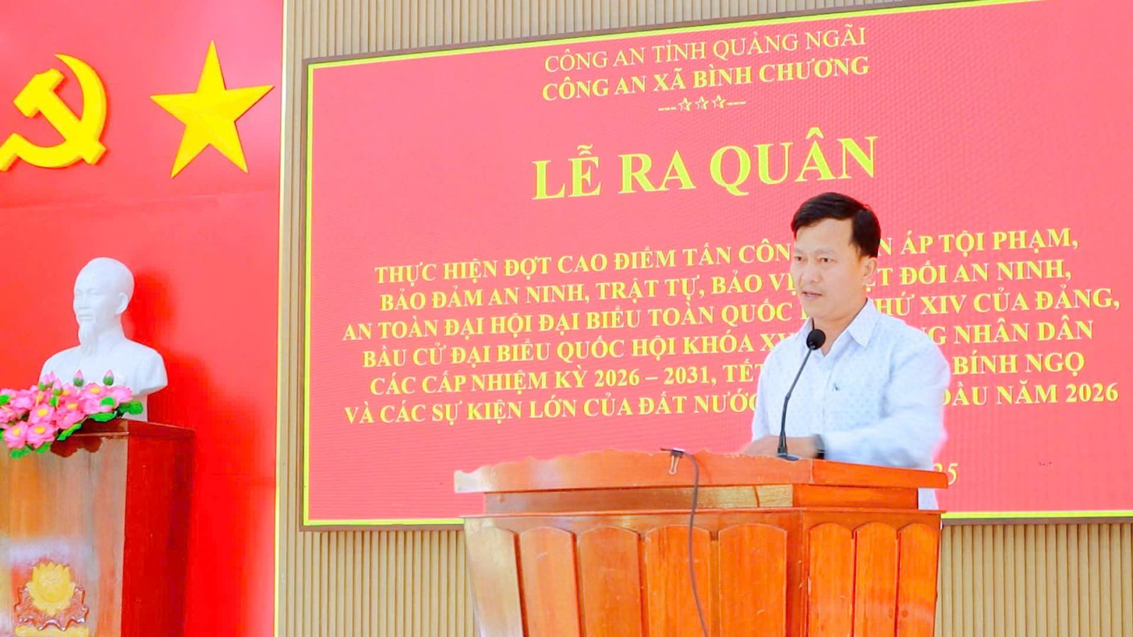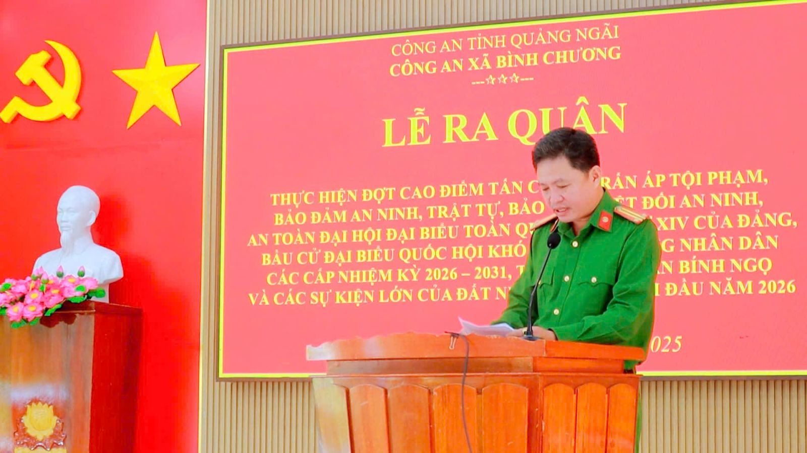 Sáng 12/12/2025, tại Hội trường UBND xã Bình Chương, Công an xã tổ chức Lễ ra quân thực hiện đợt cao điểm tấn công, trấn áp tội phạm theo Kế hoạch số 2014/KH-CAT-PV01(CS) của Giám đốc Công an tỉnh Quảng Ngãi.