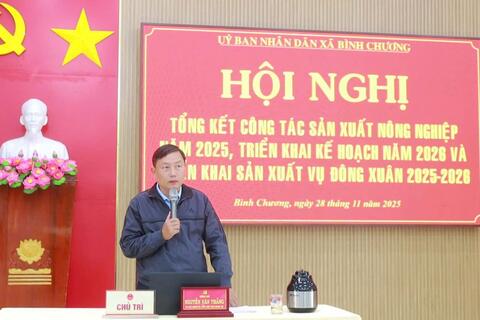 Chiều 28/11/2025, tại Hội trường UBND xã Bình Chương, UBND xã tổ chức Hội nghị tổng kết sản xuất ngành nông nghiệp năm 2025; triển khai kế hoạch sản xuất năm 2026 và phương án sản xuất vụ Đông Xuân 2025–2026. Đồng chí Nguyễn Văn Thắng, Phó Chủ tịch UBND xã, chủ trì hội nghị.